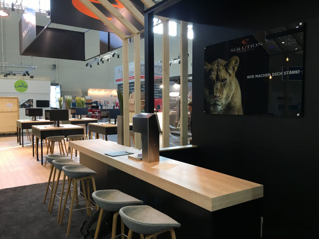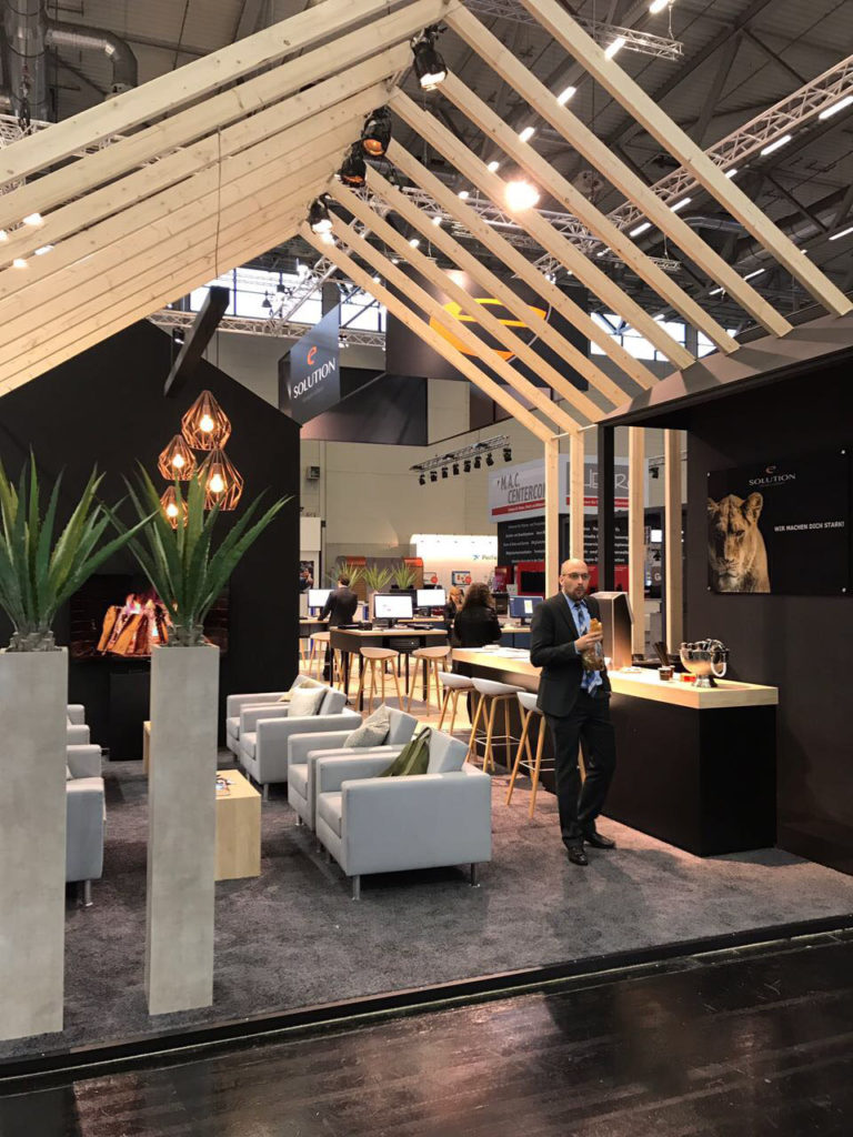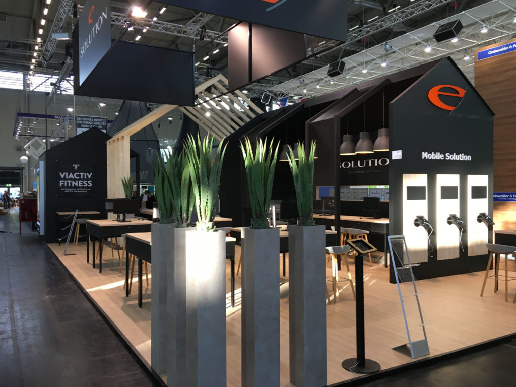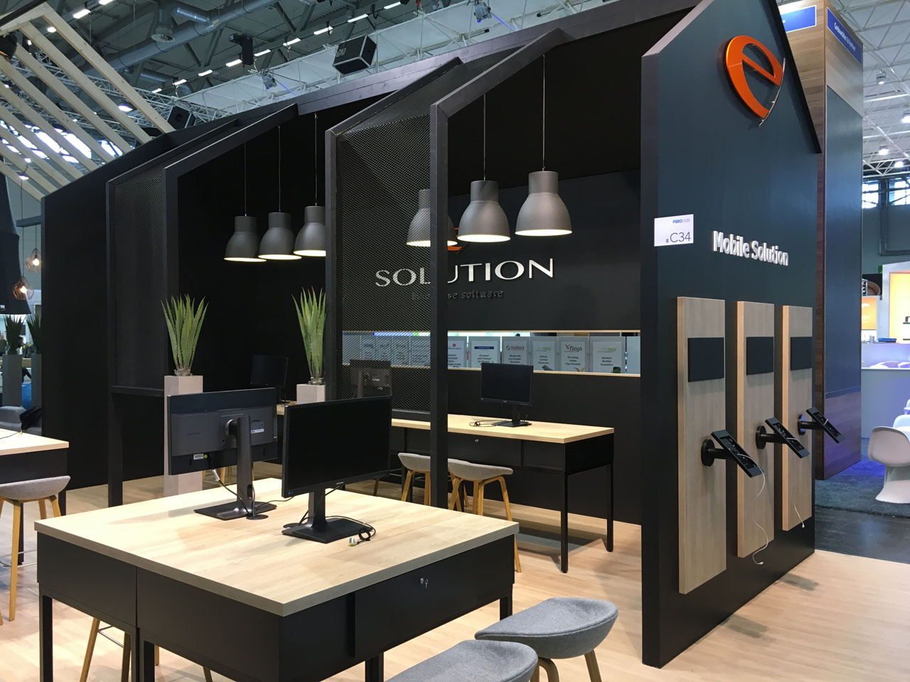 Kein 0815, sondern ein individuelles Messestandkonzept, das sollten wir für Easy Solution auf der Fibo in Köln realisieren. Die neu bezogenen Räumlichkeiten des Unternehmens waren für uns der gestalterische Ausgangspunkt: Abstrahierte Formen ergaben einen temporären Bauernhof mit einer geschlossenen Scheune als Lager, einem offenen PC-Hof und weiteren halboffenen Gebäuden als Besprechungs- oder Loungebereiche. Schwarzes und helles Holz stellten einen ursprünglichen Kontrast zur modernen Technik dar und sorgte für eine persönliche Note. Die Besucher der Messe erhielten so einen ganz neuen Blick auf das Unternehmen: von technisch-versiert zu persönlich-einladend.