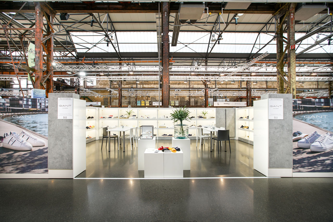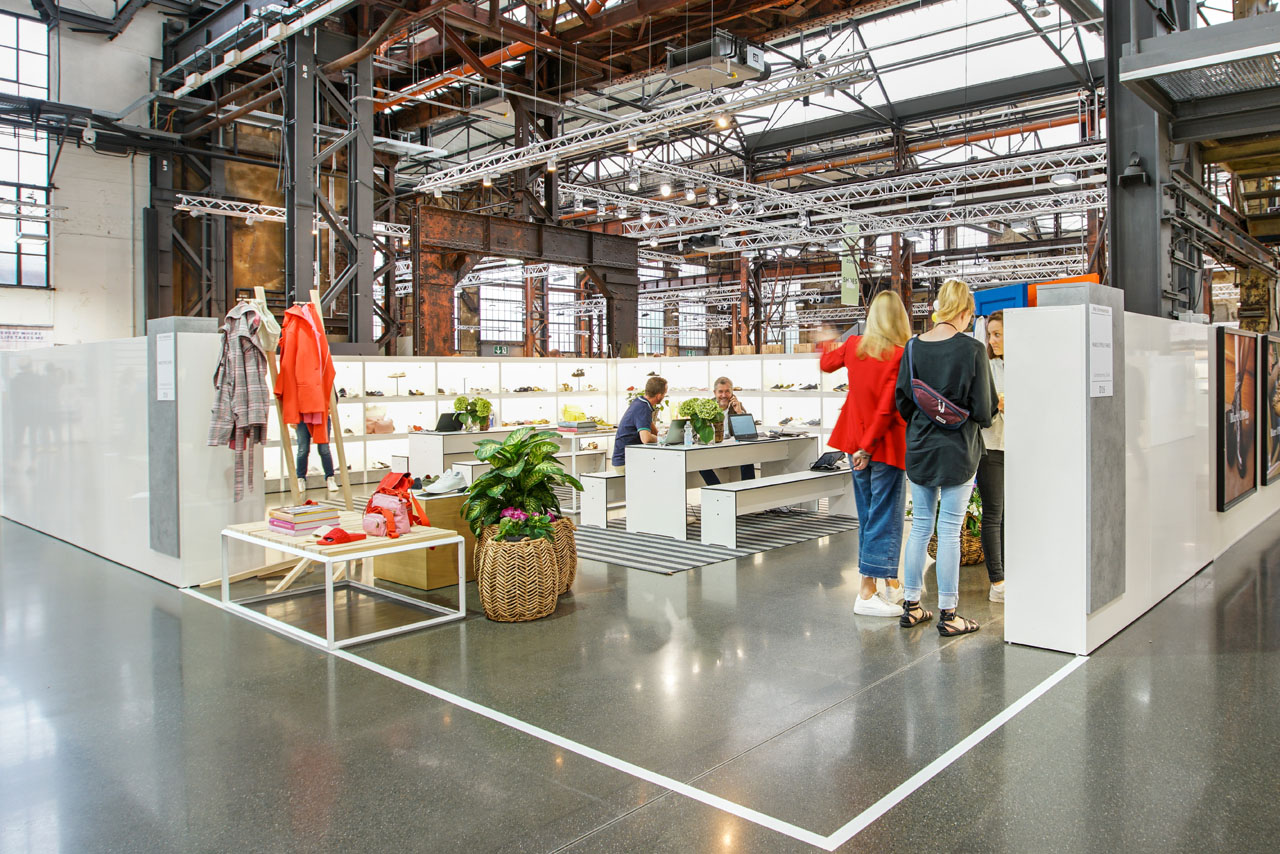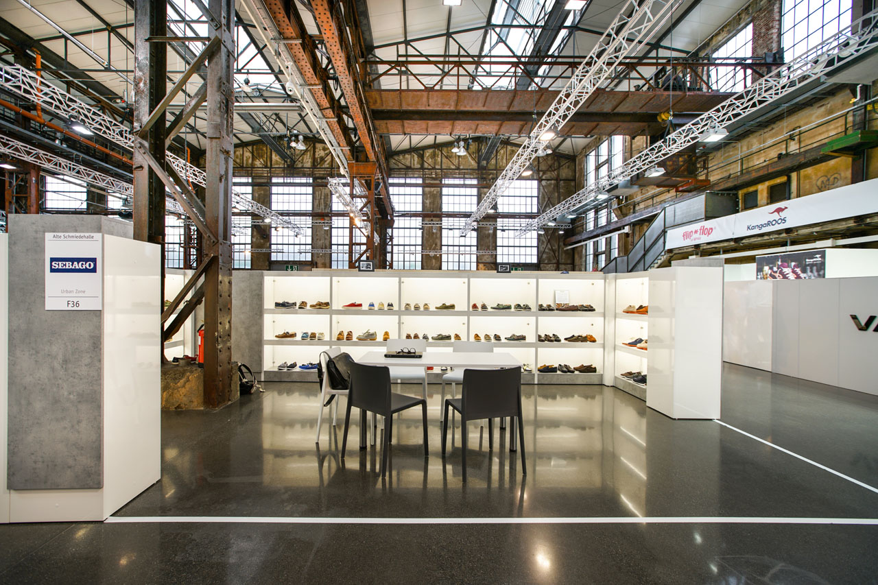 Abseits von fertigen Standbau-Systemen, entwarfen wir für die Gallery SHOES hochwertige Messestände, die einerseits den Industriecharme der Location zur Geltung brachten, andererseits die Modekollektionen perfekt inszenierten. 1,6 Meter hohe Trennwände ermöglichten den Rundumblick über die Modemesse und öffneten dadurch optisch die einzelnen Stände. Die offene Gestaltung sorgte für eine moderne, aber atmosphärische Stimmung, die die neuen Schuh- und Accessoire-Kollektionen perfekt inszenierte. Außerdem betreuten wir vor Ort Aussteller in allen Belangen bezüglich der Stände und lösten vor Ort eventuelle Probleme.