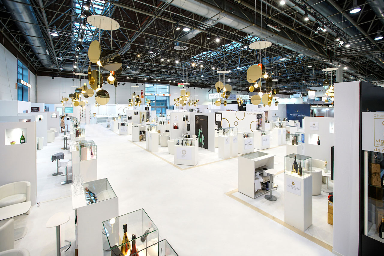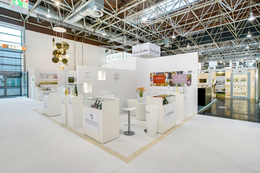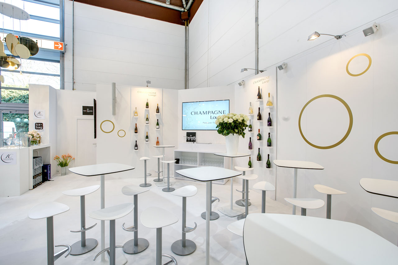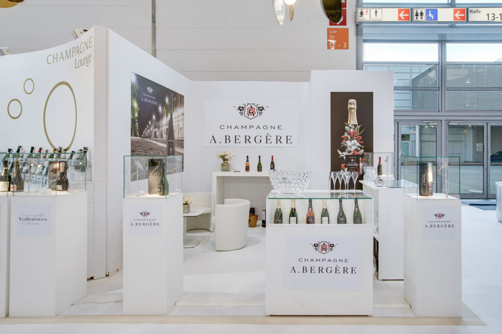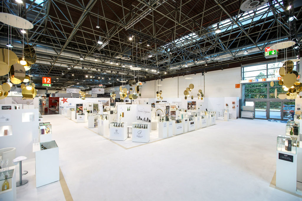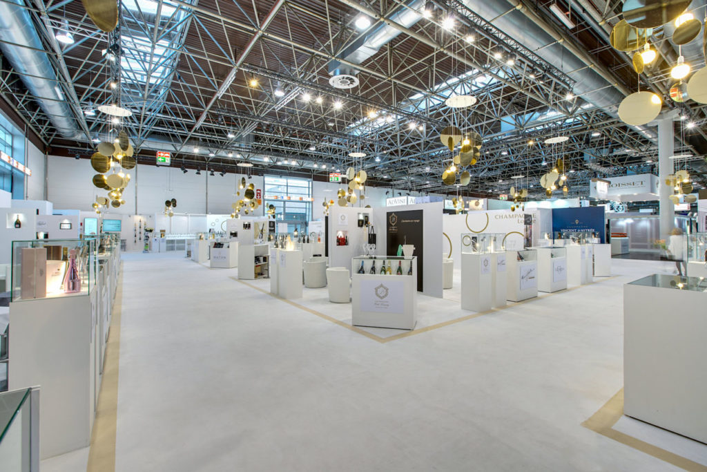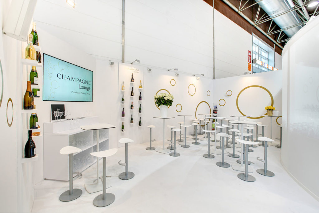 Eine bestehende Idee weiterentwickelt: Die großzügige Fläche der Champagne Lounge auf der ProWein in Düsseldorf, die sich mehrere Aussteller teilen, sollte kommunikativ und offen gestaltet sein, gleichzeitig modern erscheinen. Die Umsetzung: Für mehr Austausch wurden die Trennwände auf ein Minimum reduziert und Präsentationsdisplays hinzugefügt, um den Charakter eines edlen Marktplatzes zu verstärken. Dies zeigte sich ebenfalls innerhalb der Farben, die sich, dem Produkt entsprechend, auf Weiß und Gold beschränkten. Smarte Details: die goldenen Beleuchtungsobjekte als Metapher der Champagnerbläschen für einen optischen Wiedererkennungswert.