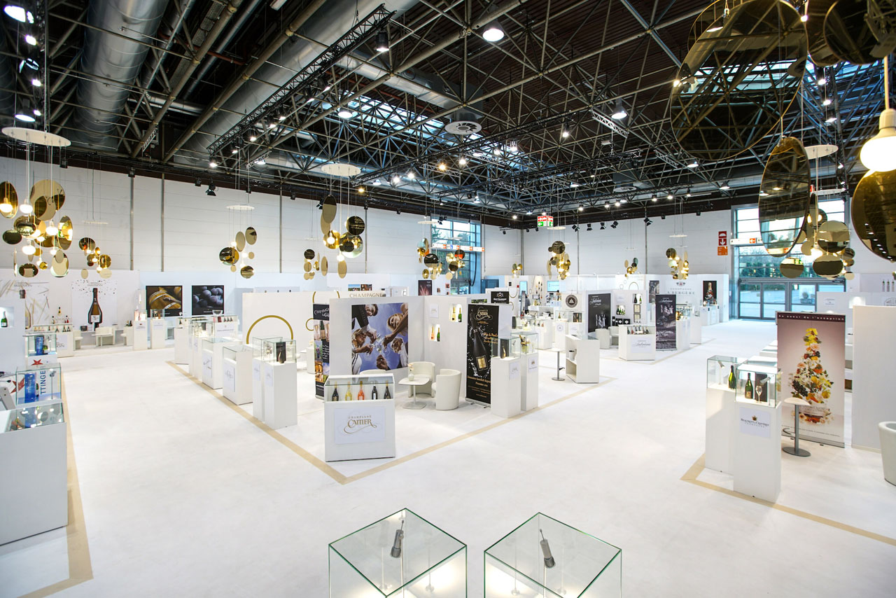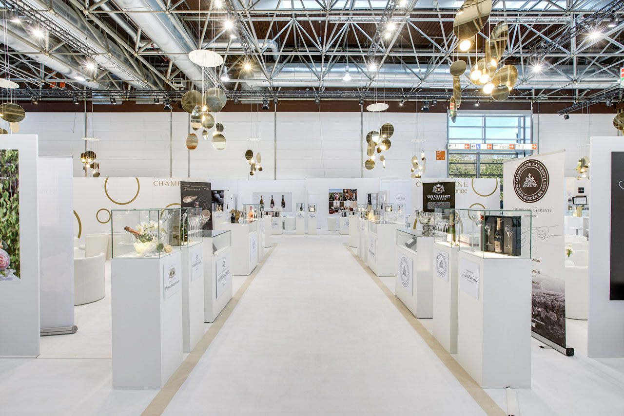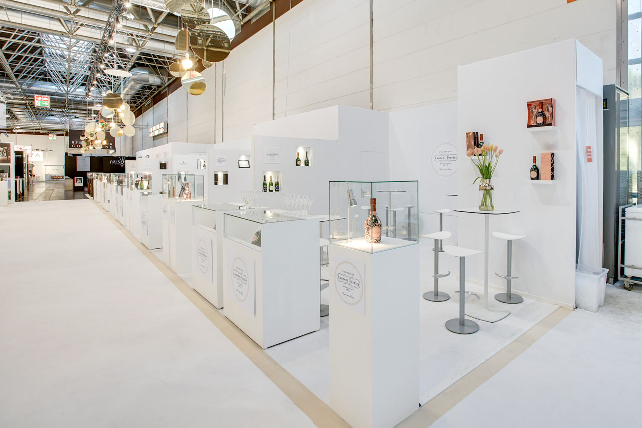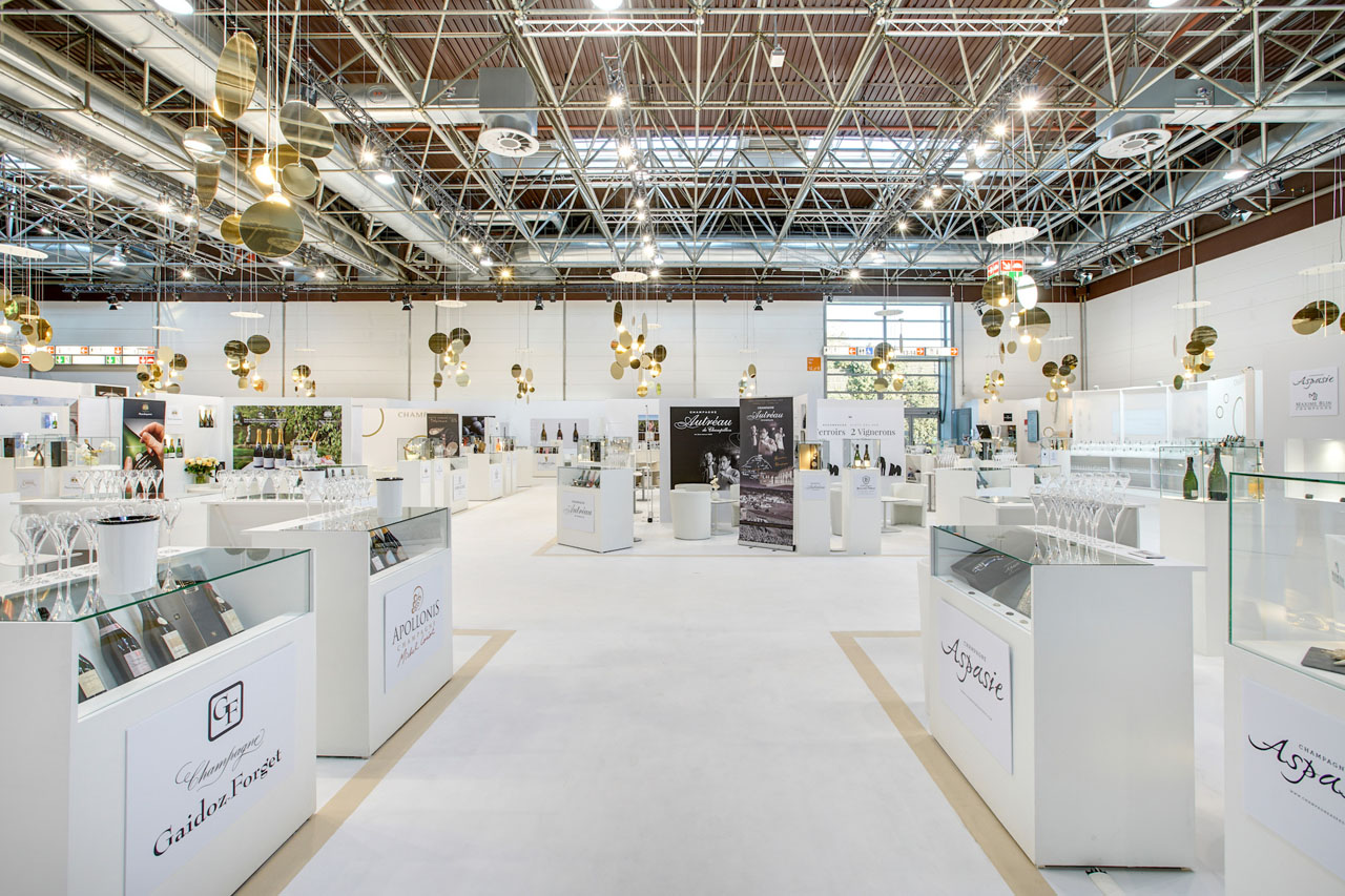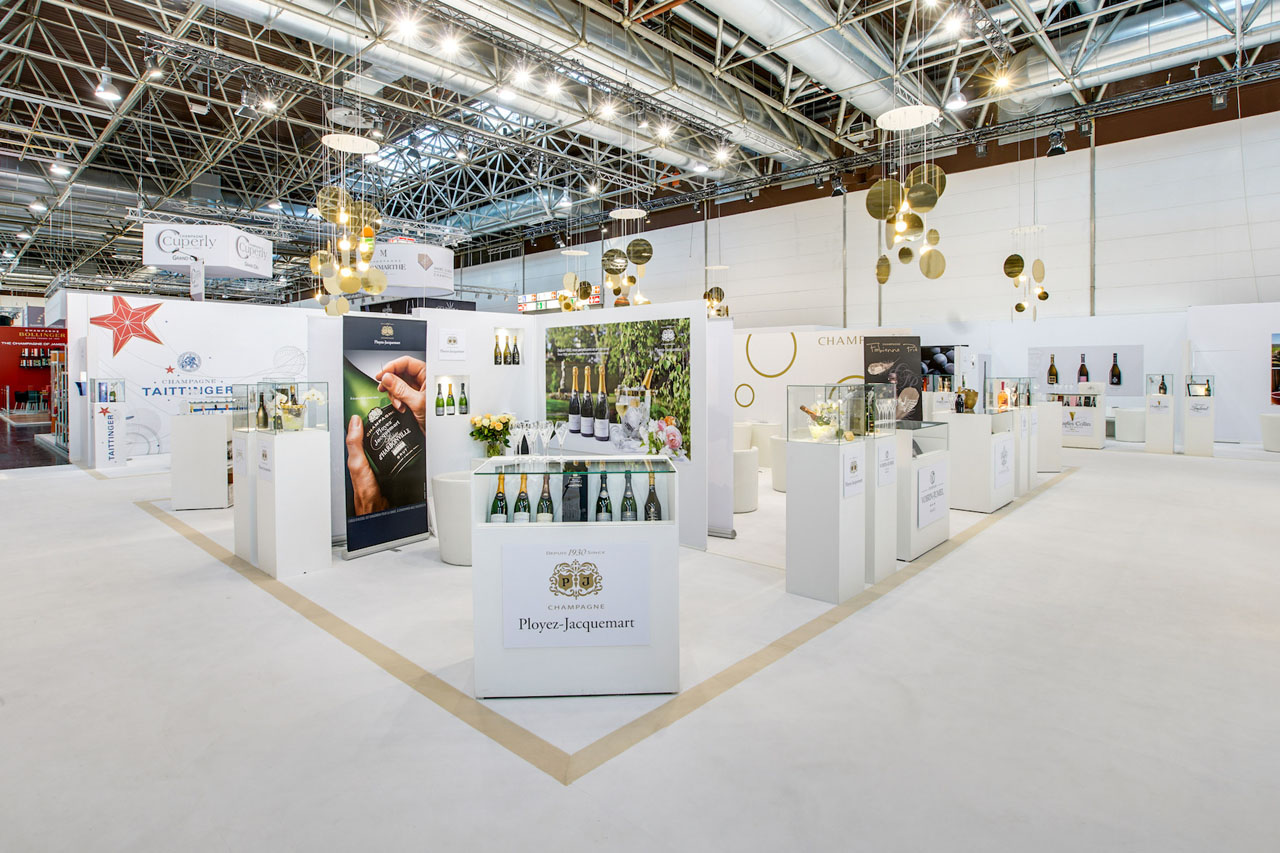 Eine bestehende Idee weiterentwickelt: Die großzügige Fläche der Champagne Lounge auf der ProWein in Düsseldorf, die sich mehrere Aussteller teilen, sollte kommunikativ und offen gestaltet sein, gleichzeitig modern erscheinen. Die Umsetzung: Für mehr Austausch wurden die Trennwände auf ein Minimum reduziert und Präsentationsdisplays hinzugefügt, um den Charakter eines edlen Marktplatzes zu verstärken. Dies zeigte sich ebenfalls innerhalb der Farben, die sich, dem Produkt entsprechend, auf Weiß und Gold beschränkten. Smarte Details: die goldenen Beleuchtungsobjekte als Metapher der Champagnerbläschen für einen optischen Wiedererkennungswert.