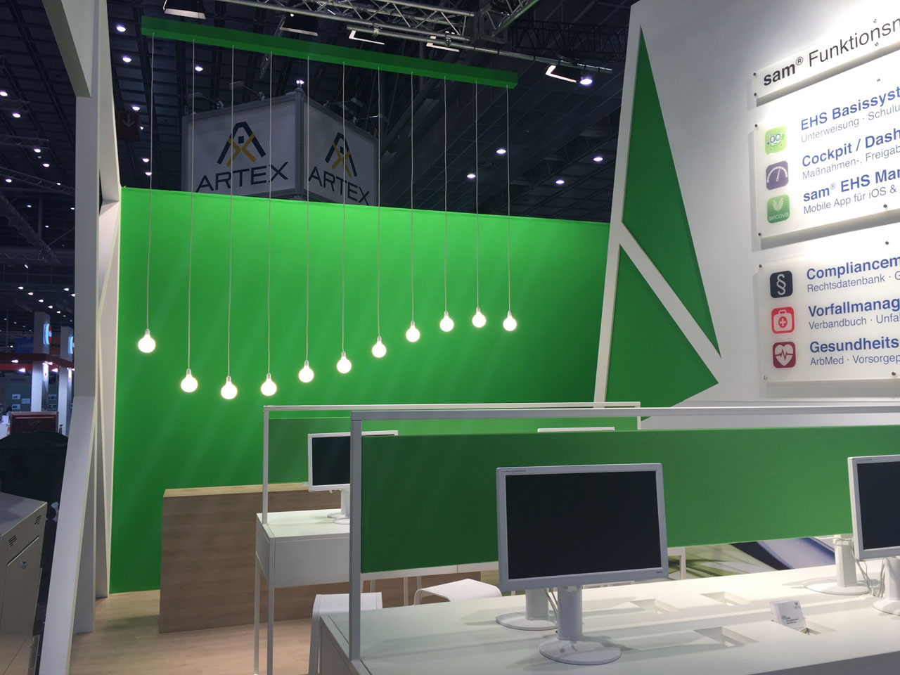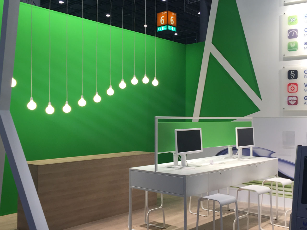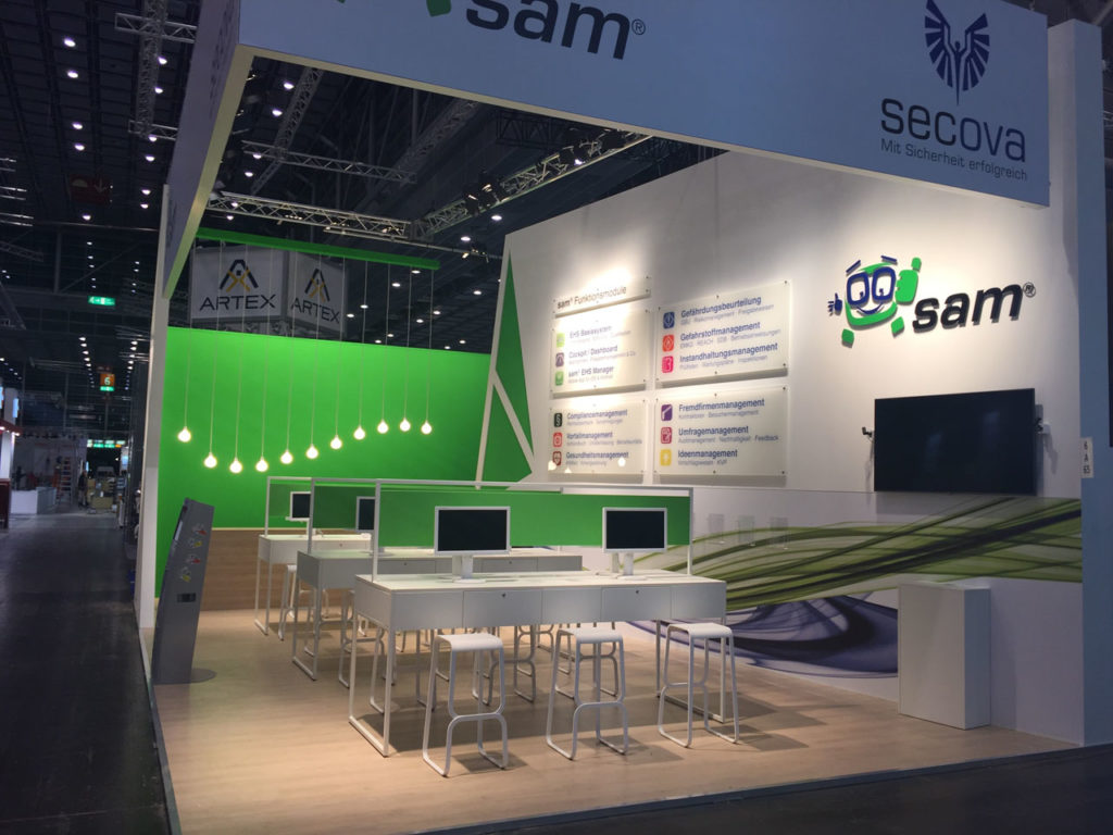 Um eine Vielzahl an Elementen auf dem Messestand der secova GmbH Rheine unterzubringen, wurde eine reduzierte Anzahl von Arbeitsplätzen geschaffen. Dadurch entstand eine Art Labor-Atmosphäre, bei der die technischen Software-Produkte klar im Fokus standen. Die moderne Optik – bedingt durch viel Weiß – wurde durch die Corporate Color des Unternehmens, nämlich Grün, ergänzt und diente damit auch als markanter Eyecatcher. An einer Wand wurden alle wichtigen Informationen zu den sevoca Produkten zusammengefasst, um dem Besucher schnell einen klaren Leistungsüberblick zu geben.