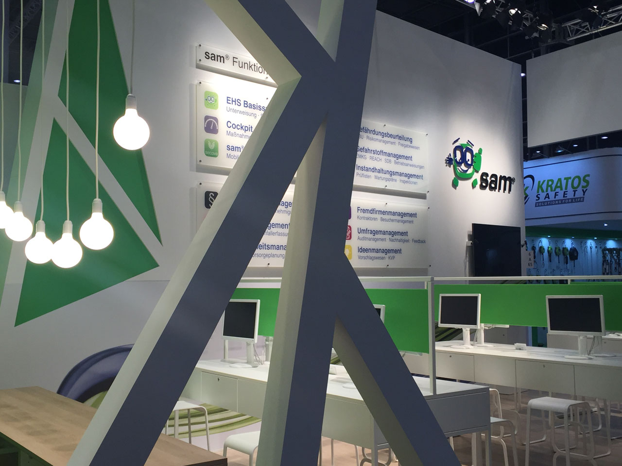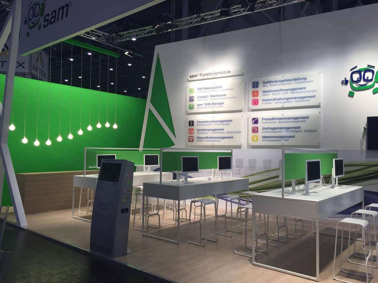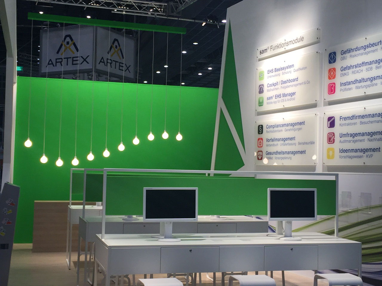 Um eine Vielzahl an Elementen auf dem Messestand der secova GmbH Rheine unterzubringen, wurde eine reduzierte Anzahl von Arbeitsplätzen geschaffen. Dadurch entstand eine Art Labor-Atmosphäre, bei der die technischen Software-Produkte klar im Fokus standen. Die moderne Optik – bedingt durch viel Weiß – wurde durch die Corporate Color des Unternehmens, nämlich Grün, ergänzt und diente damit auch als markanter Eyecatcher. An einer Wand wurden alle wichtigen Informationen zu den sevoca Produkten zusammengefasst, um dem Besucher schnell einen klaren Leistungsüberblick zu geben.
