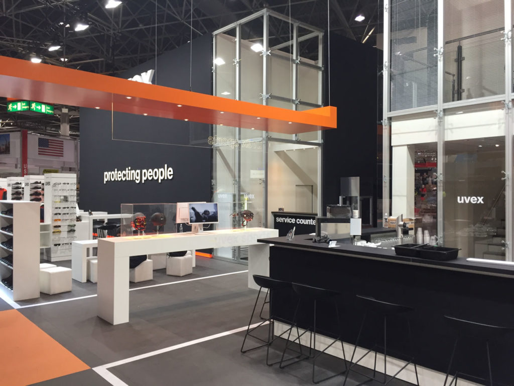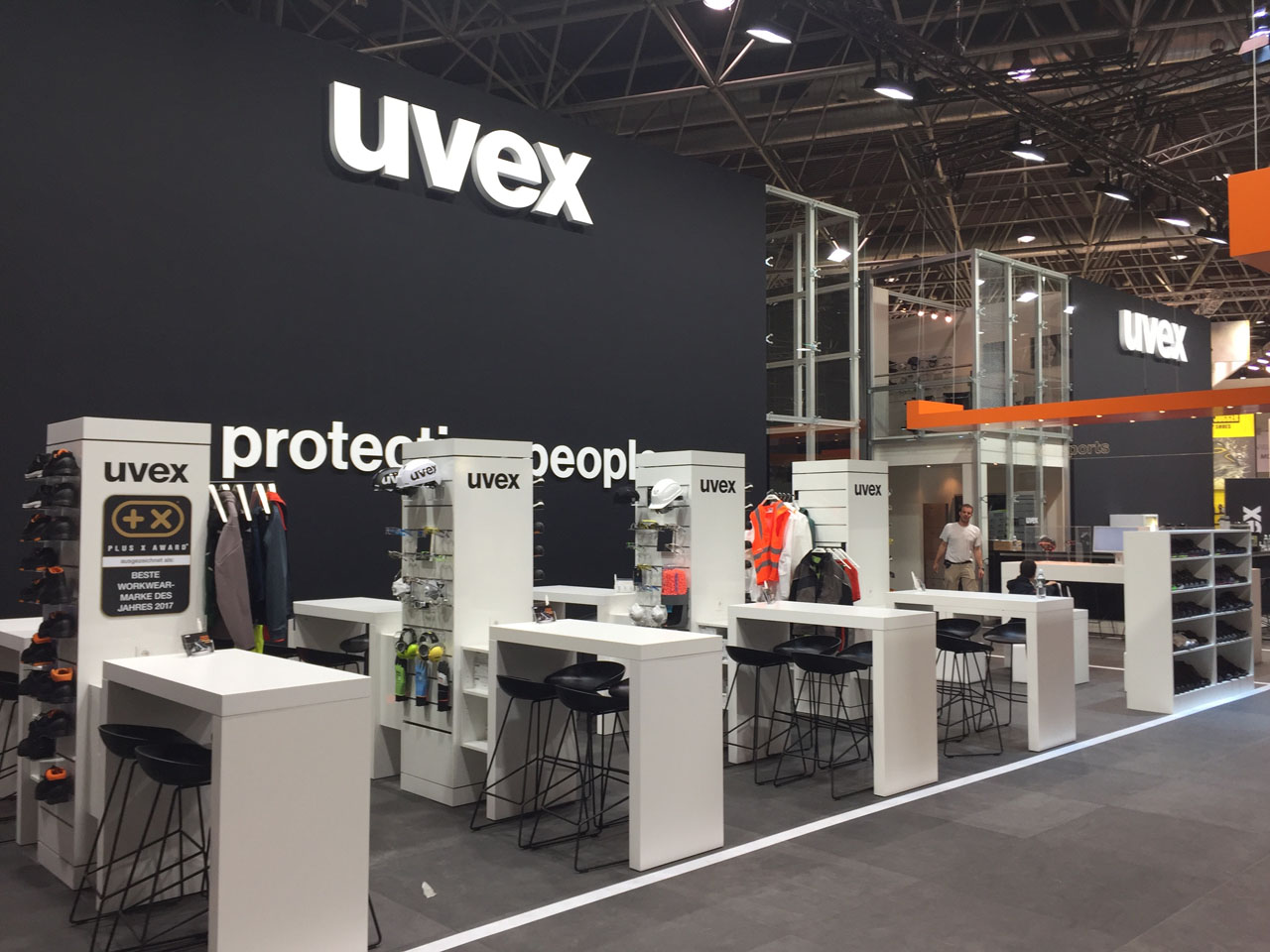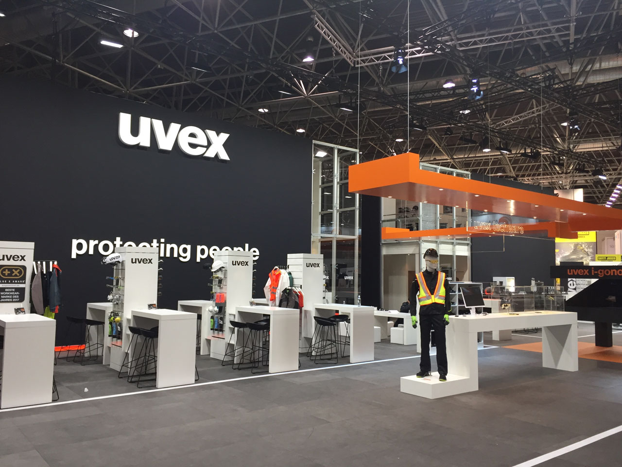 Clean, modern und dennoch auf die Produkte fokussiert – so lautete der Anspruch an den umzusetzenden Messestand für Uvex. Der Entwurf des Standes stammte von der Designabteilung der Messe Düsseldorf, den wir entsprechend realisierten. Die CI-Farben Orange, Schwarz und Weiß bildeten eine optische Klammer, die Produktneuheiten wurden zentral an speziellen Countern und Vitrinen präsentiert. Dadurch entstand auf der Fläche viel Platz für Gespräche und intensiven Kundenkontakt. Besondere Herausforderung: die textile Stoffbespannung der Fassaden der Doppelstock-Elemente sowie die Installation und Präsentation von Displays und beleuchtetem Mobiliar. Innerhalb von nur 4,5 Tagen kreierten wir dennoch einen der größten Messestände der A+A Düsseldorf.