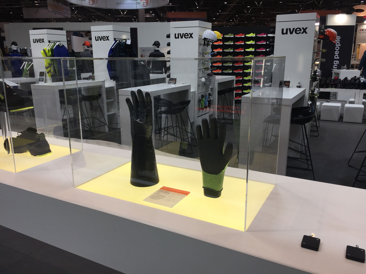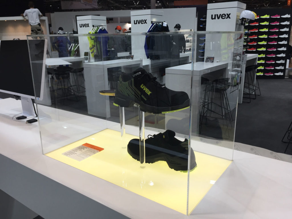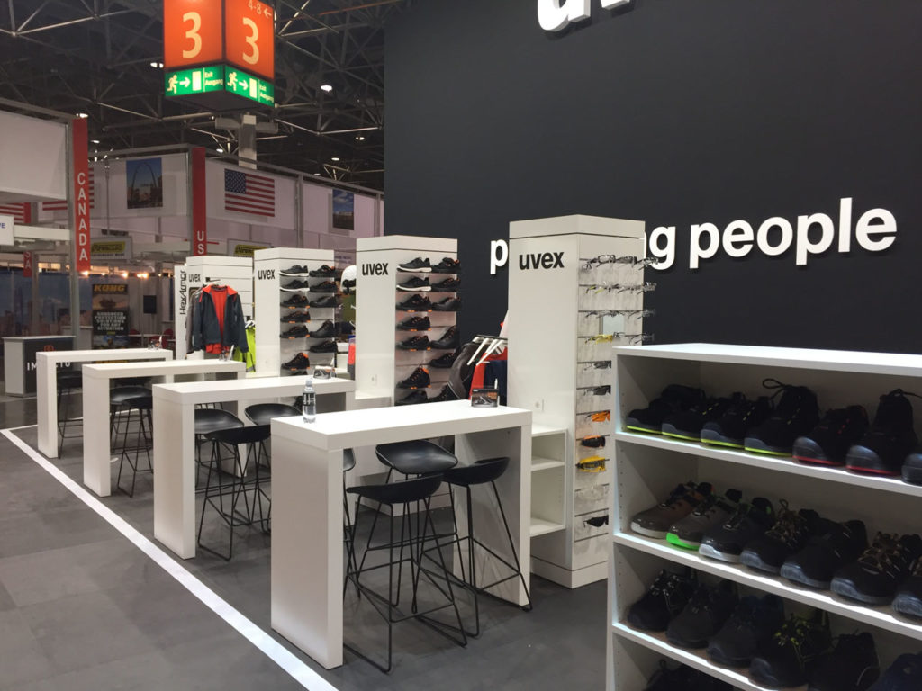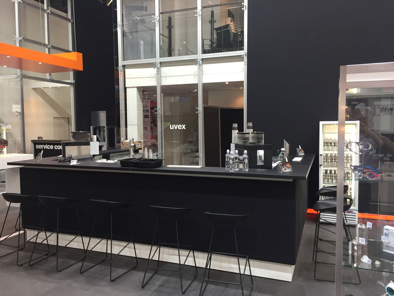Clean, modern und dennoch auf die Produkte fokussiert – so lautete der Anspruch an den umzusetzenden Messestand für Uvex. Der Entwurf des Standes stammte von der Designabteilung der Messe Düsseldorf, den wir entsprechend realisierten. Die CI-Farben Orange, Schwarz und Weiß bildeten eine optische Klammer, die Produktneuheiten wurden zentral an speziellen Countern und Vitrinen präsentiert. Dadurch entstand auf der Fläche viel Platz für Gespräche und intensiven Kundenkontakt. Besondere Herausforderung: die textile Stoffbespannung der Fassaden der Doppelstock-Elemente sowie die Installation und Präsentation von Displays und beleuchtetem Mobiliar. Innerhalb von nur 4,5 Tagen kreierten wir dennoch einen der größten Messestände der A+A Düsseldorf.